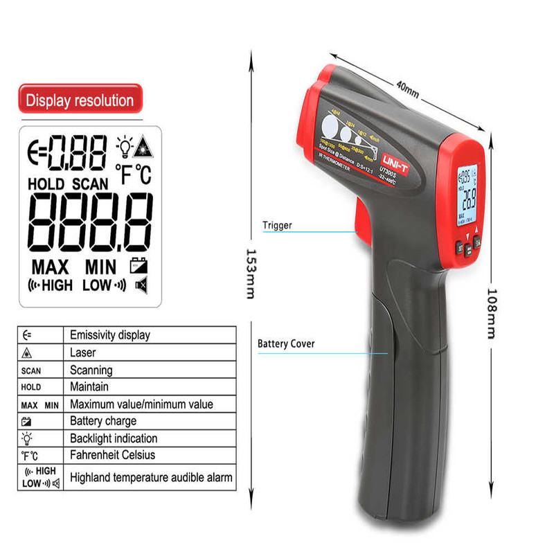 خاموشی خودکار دارای اسکنر دارای مد MAX/MIN دارای آلارم درجه حرارت پایین دارای محدوده دمایی ۳۲- تا ۴۰۰ درجه سانتی گراد دارای زمان پاسخگویی ۵۰۰ میلی ثانیه قابلیت تنظیم ضریب باز تابش