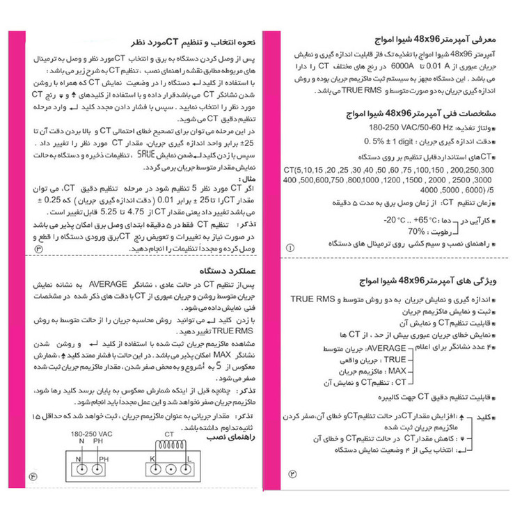 ولتاژ تغذيه : 180VAC-250VAC /50-60Hz كارآيي در دما : °20- الي °65+ كارآيي در رطوبت : %70 IP 20 زمان تنظيم CT : از زمان وصل برق به مدت 5 دقيقه