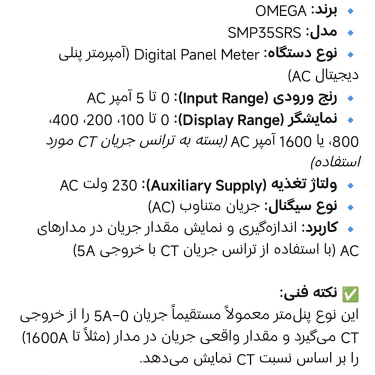 دامنه جریان AC: 0 تا 1600 آمپر متناوب (بسته به ترانس CT مورد استفاده)