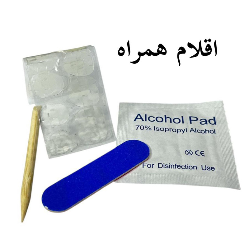 پد الکلی 70% جهت پاکسازی و آمادهسازی سطح ناخن و سوهان ناخن کوچک برای فرمدهی اولیه داخل بسته می باشد . چسب ناخن شفاف (استیکر ژلهای) مخصوص نصب آسان و بیضرر برای کودکان و چوب مانیکور جهت کمک به نصب و جداسازی ایمن می باشد.