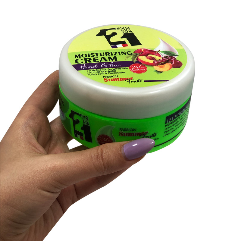 کرم مرطوب کننده با اسانس چند میوه حاوی اسانس میوه ، موم زنبور عسل، گلیسیرین،وازلین ، مرطوب نگهدارنده پوست به مدت 24 ساعت