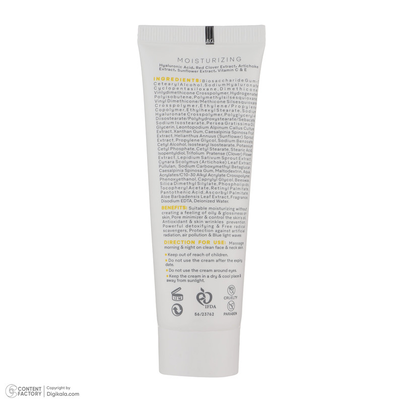حاوی هیالورونیک اسید، عصاره شبدر قرمز، عصاره آرتیشو، عصاره آفتابگردان، ویتامین E و C