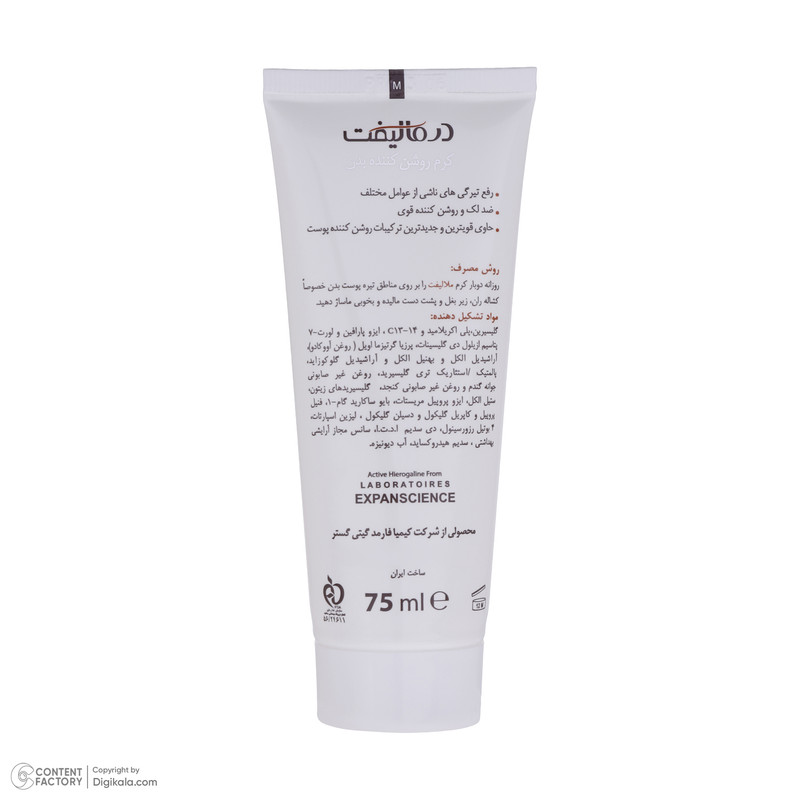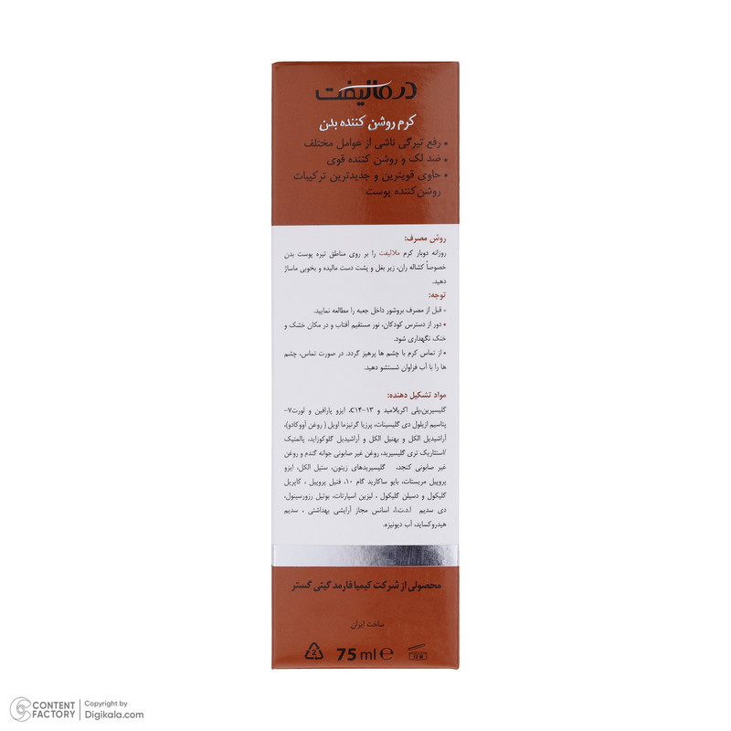 روزانه دو بار کرم ملالیفت را بر روی مناطق تیره پوست بدن خصوصا کشاله ران، زیر بغل و پشت دست مالیده و به خوبی ماساژ دهید.