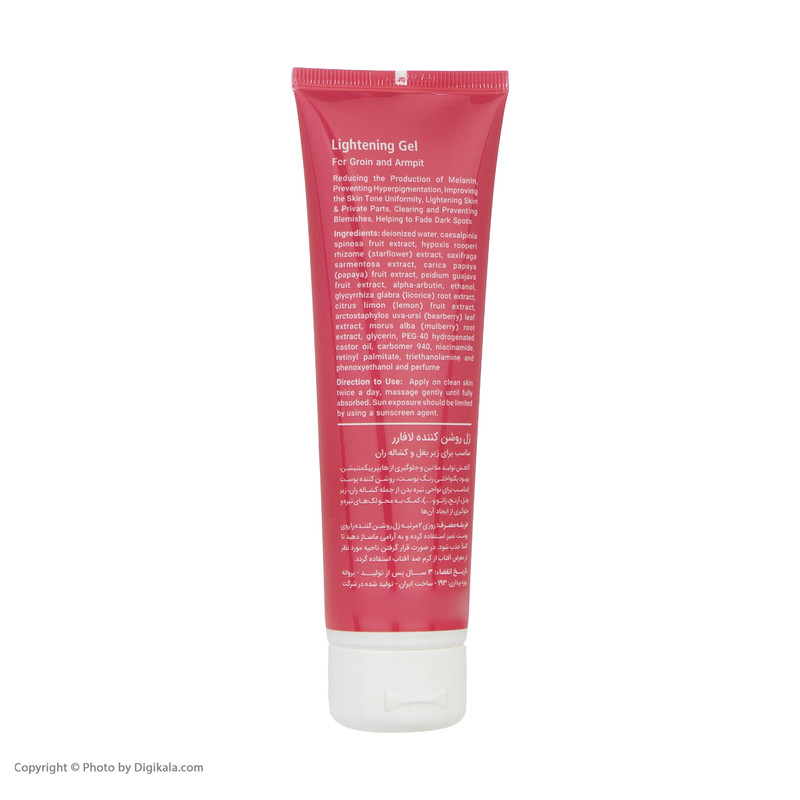 این ژل روشن کننده ، نواحی تیره بدن از جمله زیر بغل را را به خوبی پوشش داده و سبب جلوگیری از ایجاد لک های تیره و همچنین محو و یکنواختی آن ها شده که در نتیجه باعث روشن شدن و یکدست شدن پوست می شود.