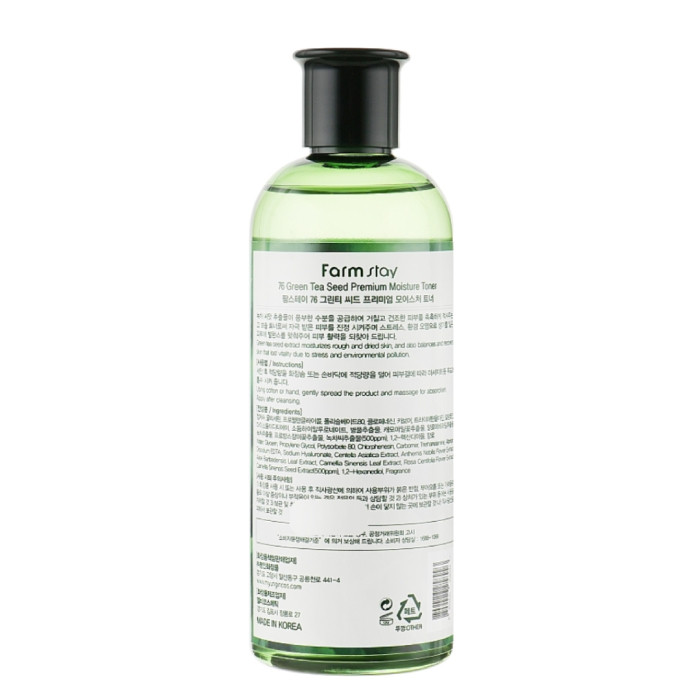 FarmStay 76 Green Tea Seed Premium Moisture Toner یک تونر مرطوب کننده با عصاره دانه چای سبز است که به آبرسانی و نرم کردن پوست خشک کمک میکند. این محصول همچنین به تعادل و بازیابی پوستی که به دلیل استرس و آلودگی محیطی دچار از دست دادن حیات شده، کمک میکند. سدیم هیالورونات و گلیسیرین موجود در این تونر دو ماده مرطوب کننده هستند که به حفظ رطوبت پوست کمک میکنند. عصاره دانه چای سبز (Camellia Sinensis Seed Extract) یک مرطوب کننده و دارای خواص ضد التهابی بالاست. عصاره رزماری (Rosmarinus Officinalis Extract) دارای خواص ضد میکروبی و مرطوب کننده است. این تونر با استفاده منظم، میتواند به بهبود بافت پوست، کاهش چین و چروکهای ریز و کاهش عمق چروکهای برجسته کمک کند و همچنین به مقابله با بروز جوشهای پوستی و جلوگیری از ایجاد جوشهای جدید کمک میکند.