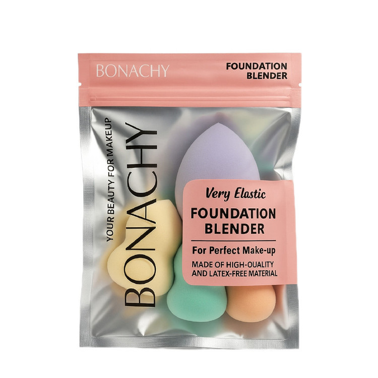 ست پد آرایشی BONACHY مدل Very Elastic شامل ۴ عدد اسفنج آرایشی در دو سایز متفاوت است: یک عدد پد بزرگ برای پوشش کامل صورت و سه عدد پد کوچک مخصوص نقاط ظریف مانند زیر چشم و اطراف بینی.