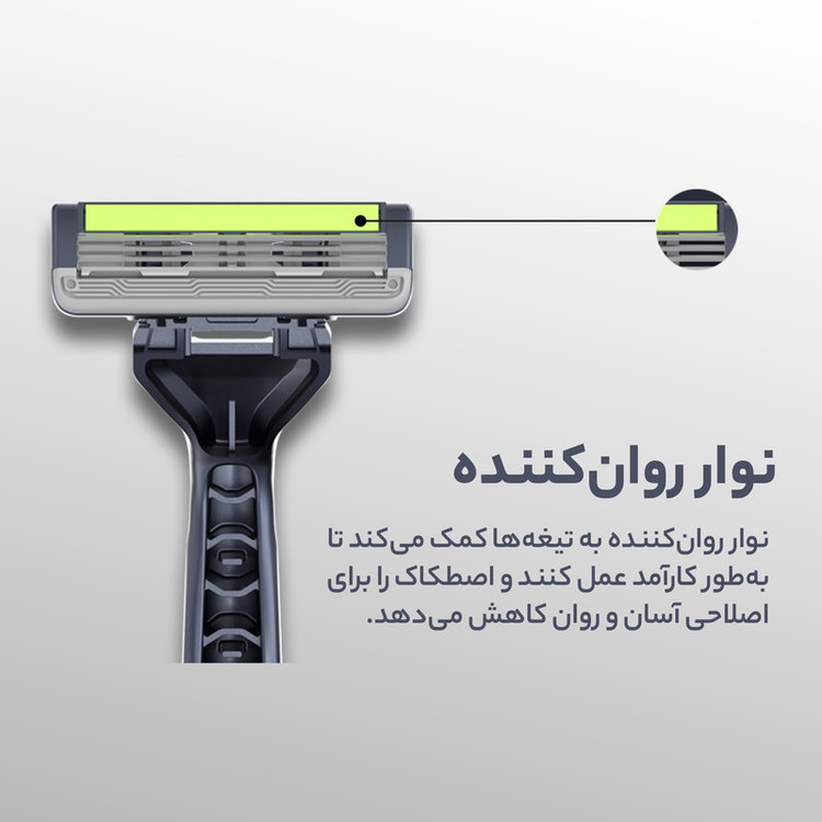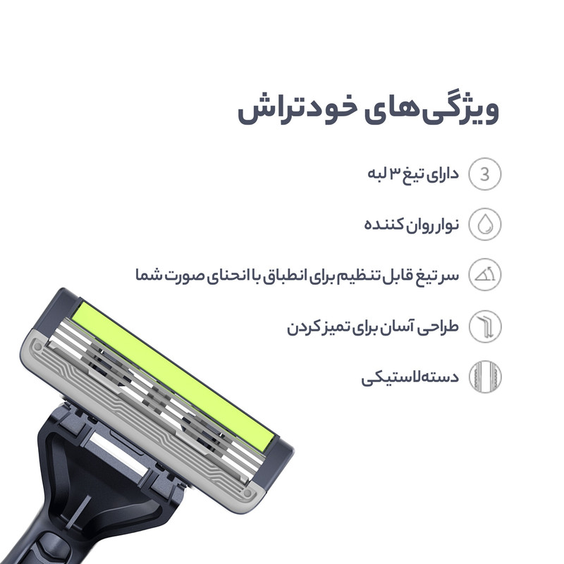 - دارای تیغ 3 لبه برای اصلاحی سریع و راحت - دارای نوار صابون حاوی ویتامین E و عصاره آلو ورا برای اصلاح روان صورت - قابلیت استفاده هر خودتراش برای یک ماه اصلاح هر روز - تیغه ها ساخت کشور کره جنوبی - دسته ساخت ویتنام