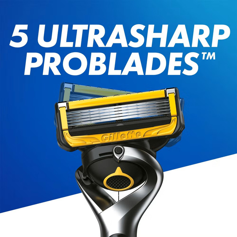 ژیلـت Gillette Fusion5+1 ProShield Power یکی از حرفهایترین و محبوبترین مدلهای ژیلت برای اصلاح صورت است. دارای 5 تیغ بسیار نازک و نزدیک به هم برای اصلاح فوقالعاده نرم و بدون فشار زیاد است همچنین یک تیغ تریمر (اضافی در پشت) برای خط انداختن ریش و اصلاح دقیق نواحی سخت (مثل زیر بینی و خط ریش) دارد. نوار زرد رنگی که در بالا و پایین تیغ قرار دارد قبل و بعد از عبور تیغ روی پوست، لایهای روانکننده ایجاد میکند تا اصطکاک کم بشود و از سوزش و تحریک جلوگیری کند. این مدل "Power" هست و با باتری کار میکند لرزشهای ملایم به اصلاح کمک میکند تا تیغ راحتتر روی صورت حرکت کند و موها سریعتر اصلاح شوند. سر تیغ انعطافپذیر طراحی شده تا به راحتی با خطوط صورت (فک، چانه، گونه) تطبیق پیدا کند. هر کارتریج (تیغ یدکی) معمولاً بین 3 تا 4 هفته دوام دارد (بسته به میزان اصلاح). طراحی خاص نوارهای ژل و تکنولوژی ProShield باعث میشود برای پوستهای حساس هم مناسب باشد.
