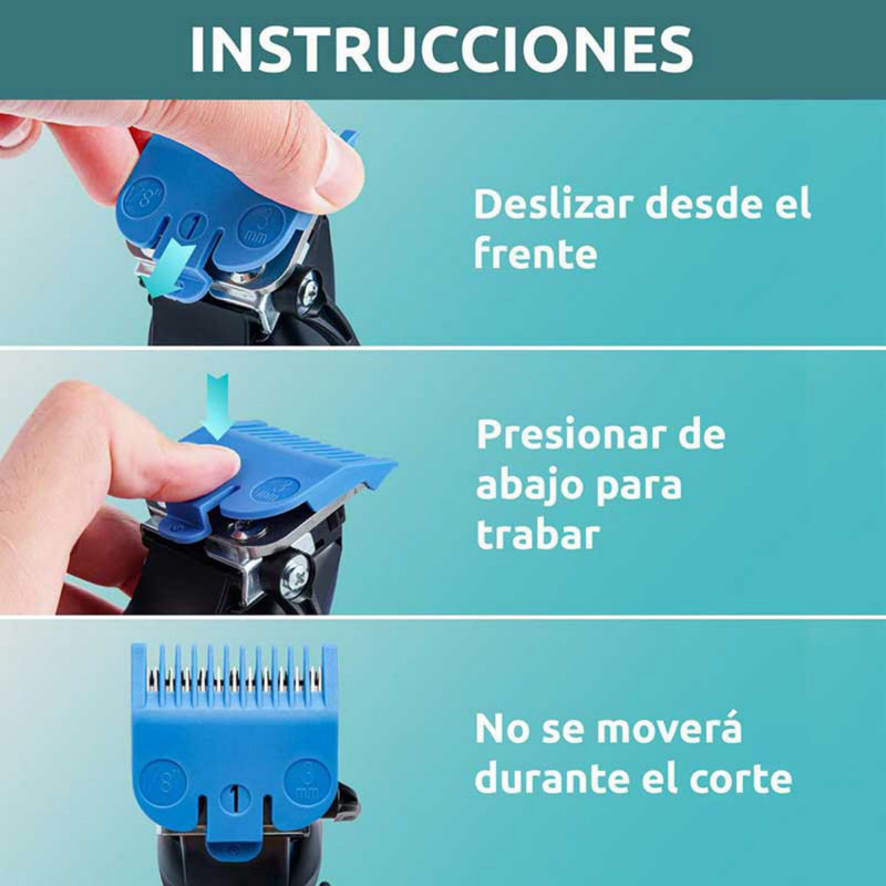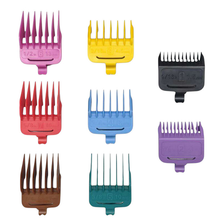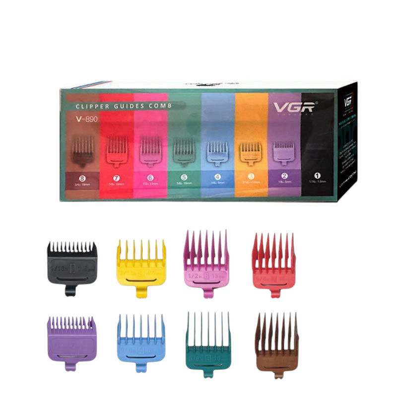 ست کامل شانه اصلاح حجم زن از برند وی جی آر مدل وی جی آر وی-۸۹۰ تعداد شانه ها 8 عدد سایز بندی از 1.5 الی 19 میلی متر جنس بدنه ABS قابل استفاده برای ماشین اصلاح های حجم زن