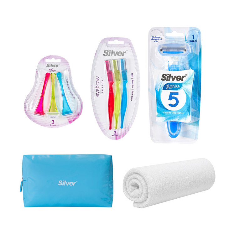 ۱ عدد خودتراش با تیغ ۵ لبه، خودتراش صورت بسته ۳ عددی، خودتراش بانوان بسته ۳ عددی و ۱ عدد حوله کوچک به همراه کیف
