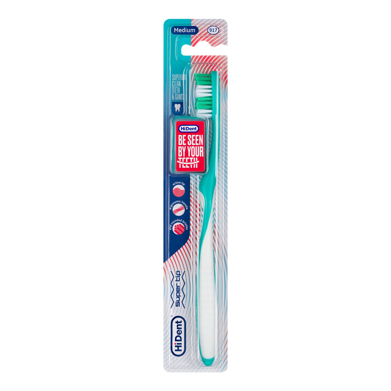 مسواک سوپرتیپ مدیوم هایدنت با طراحی مناسب، دسته ارگونومیک جهت کنترل بهتر مسواک و استفاده از الیاف با سختی متوسط و انتهای گردشده می تواند ضمن پاکیزگی کامل دندان ها، از آسیب به مینای دندان و لثه ها جلوگیری نماید.