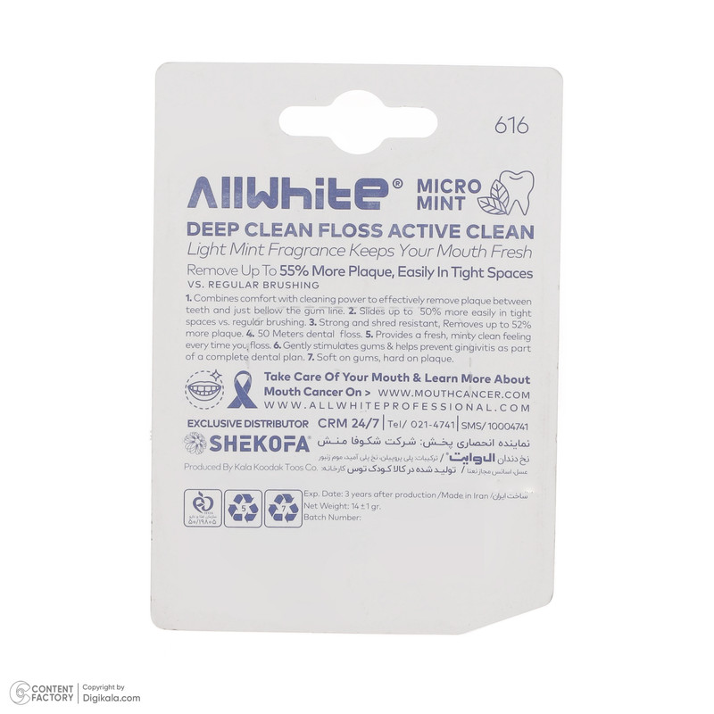 دستهبندی: نخ دندانویژگیهای محصول بهداشتی: کاهش دهنده پلاک دندانصادرکننده مجوز: سازمان غذا و داروشماره مجوز: 50/19805